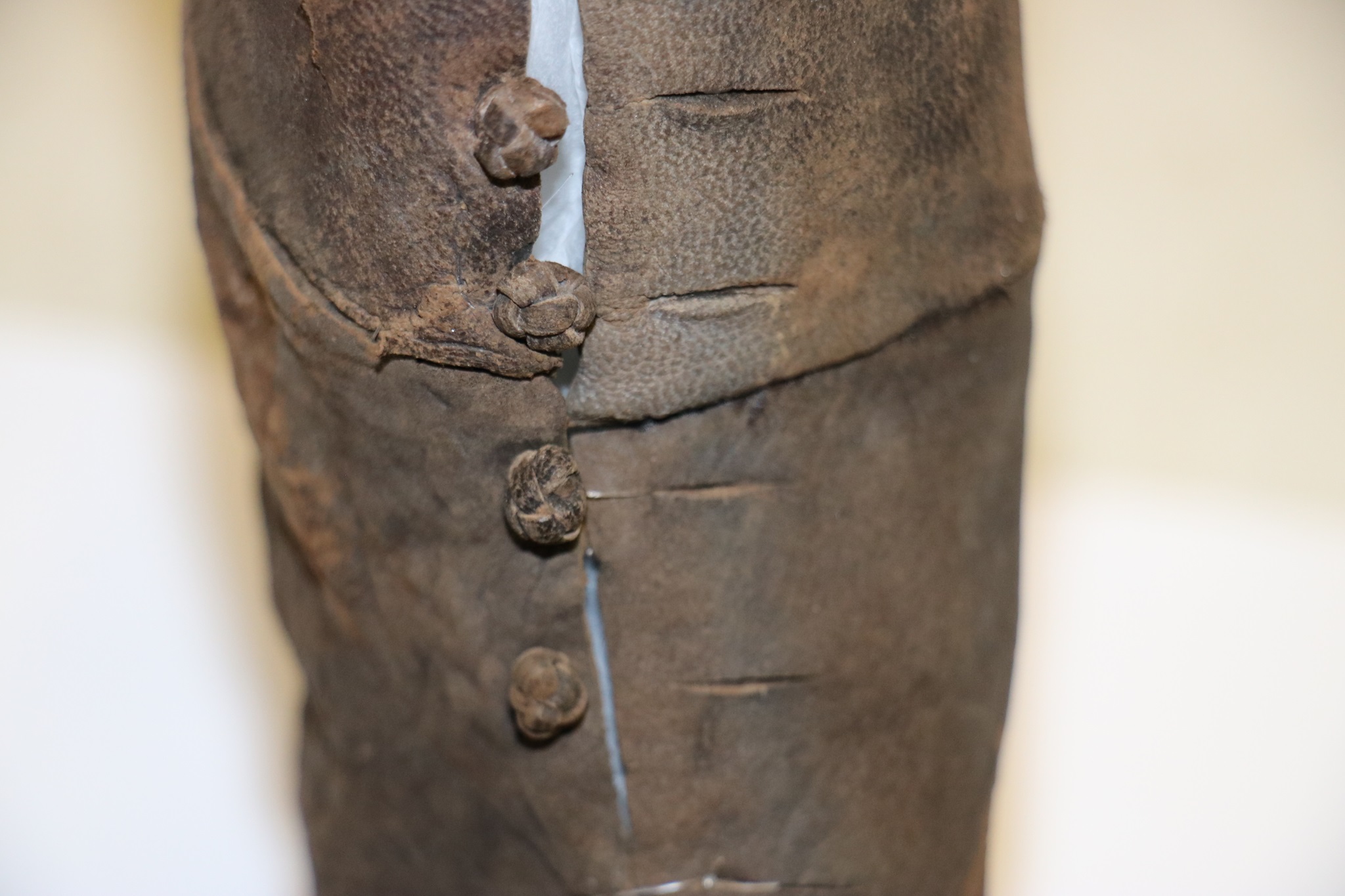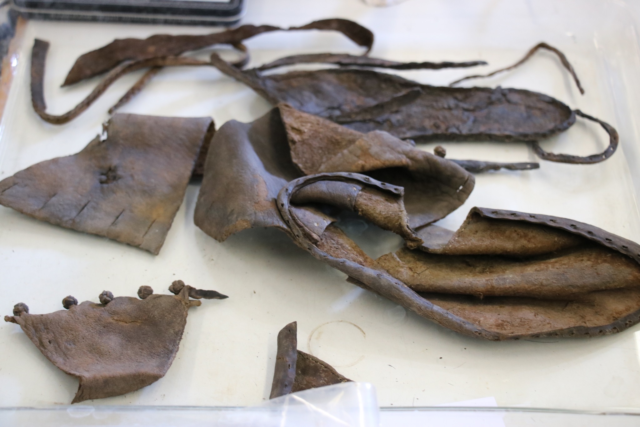 Bild in Lightbox öffnen (open image in lightbox). Einzelteile des Kinderschuhs aus einerLatrine, bereits mit PEG konserviert.